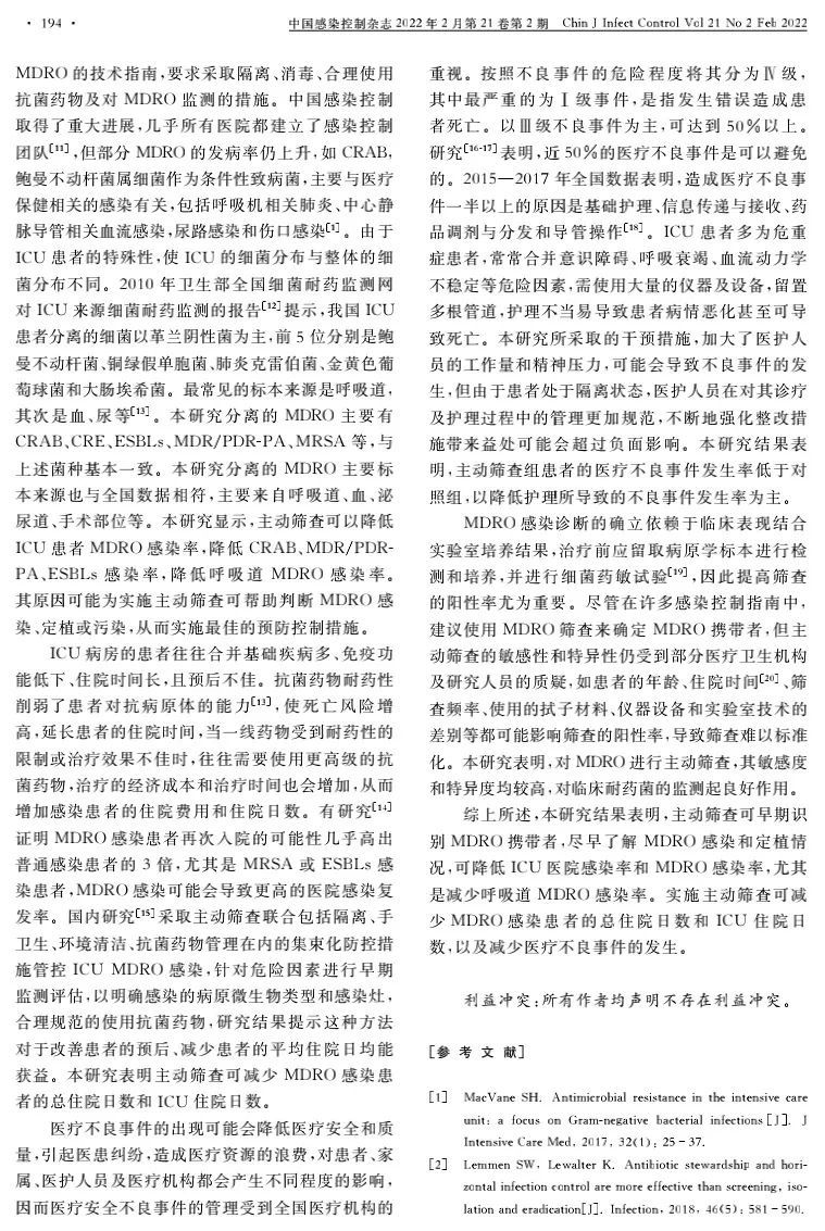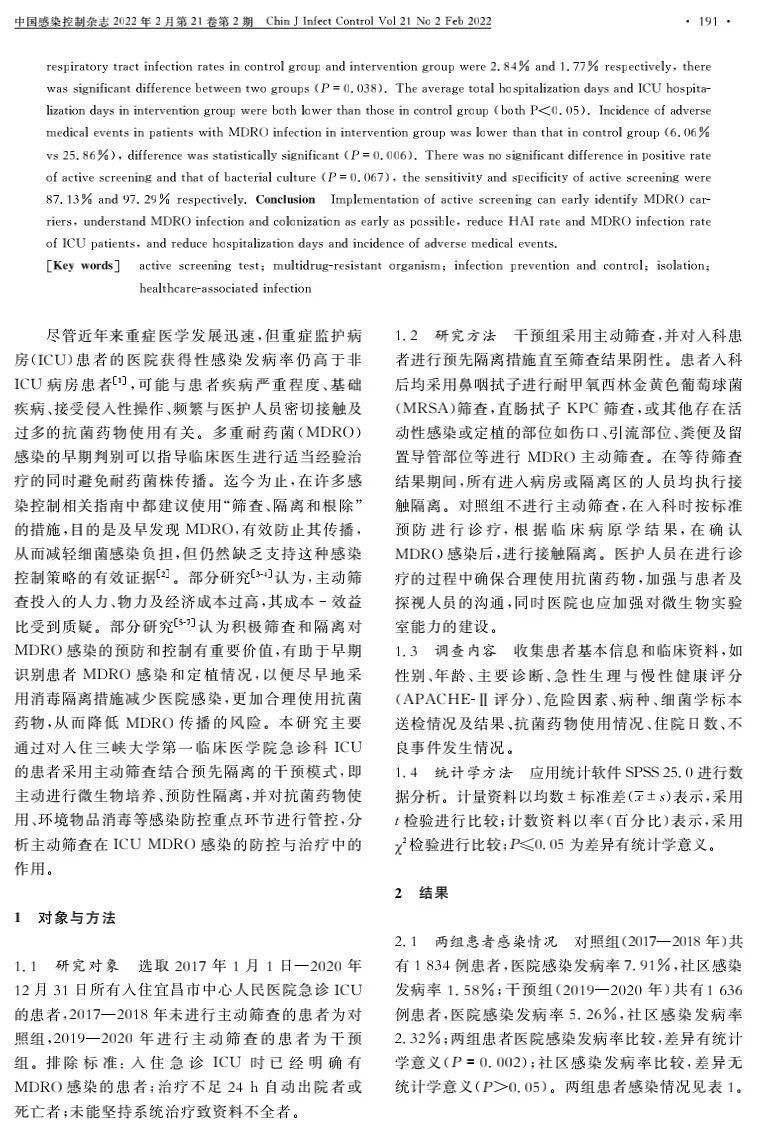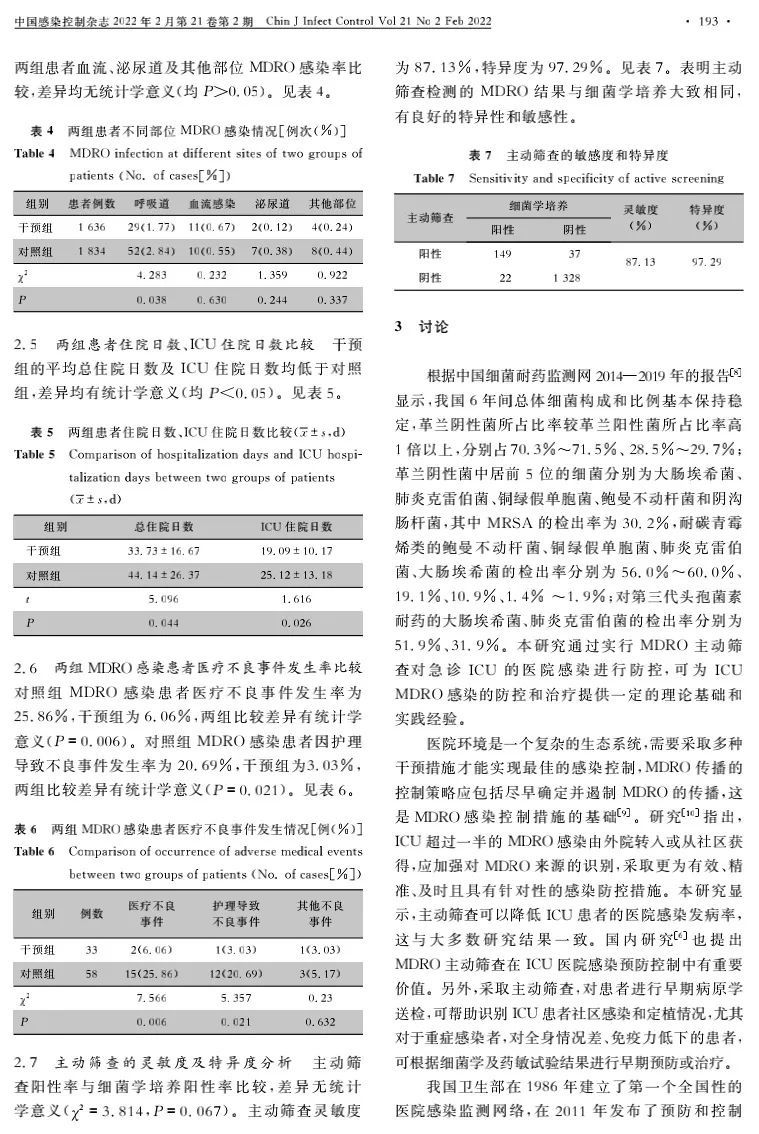 结论 实施主动筛查可以早期识别 MDRO携带者,尽早了解 MDRO感染和定植情况,可降低ICU患者医院感染率和 MDRO感染率,降低住院日数和医疗不良事件发生率。